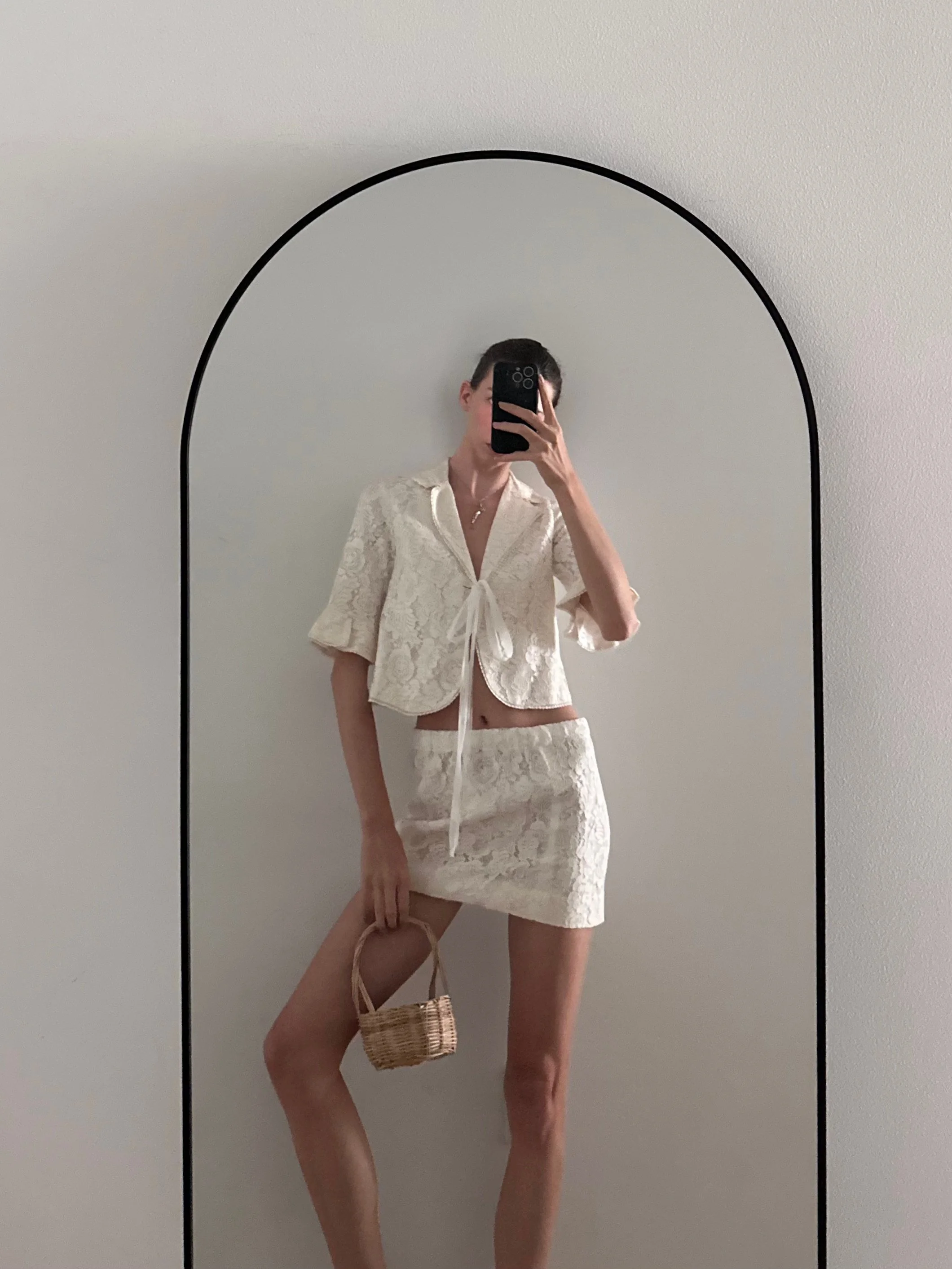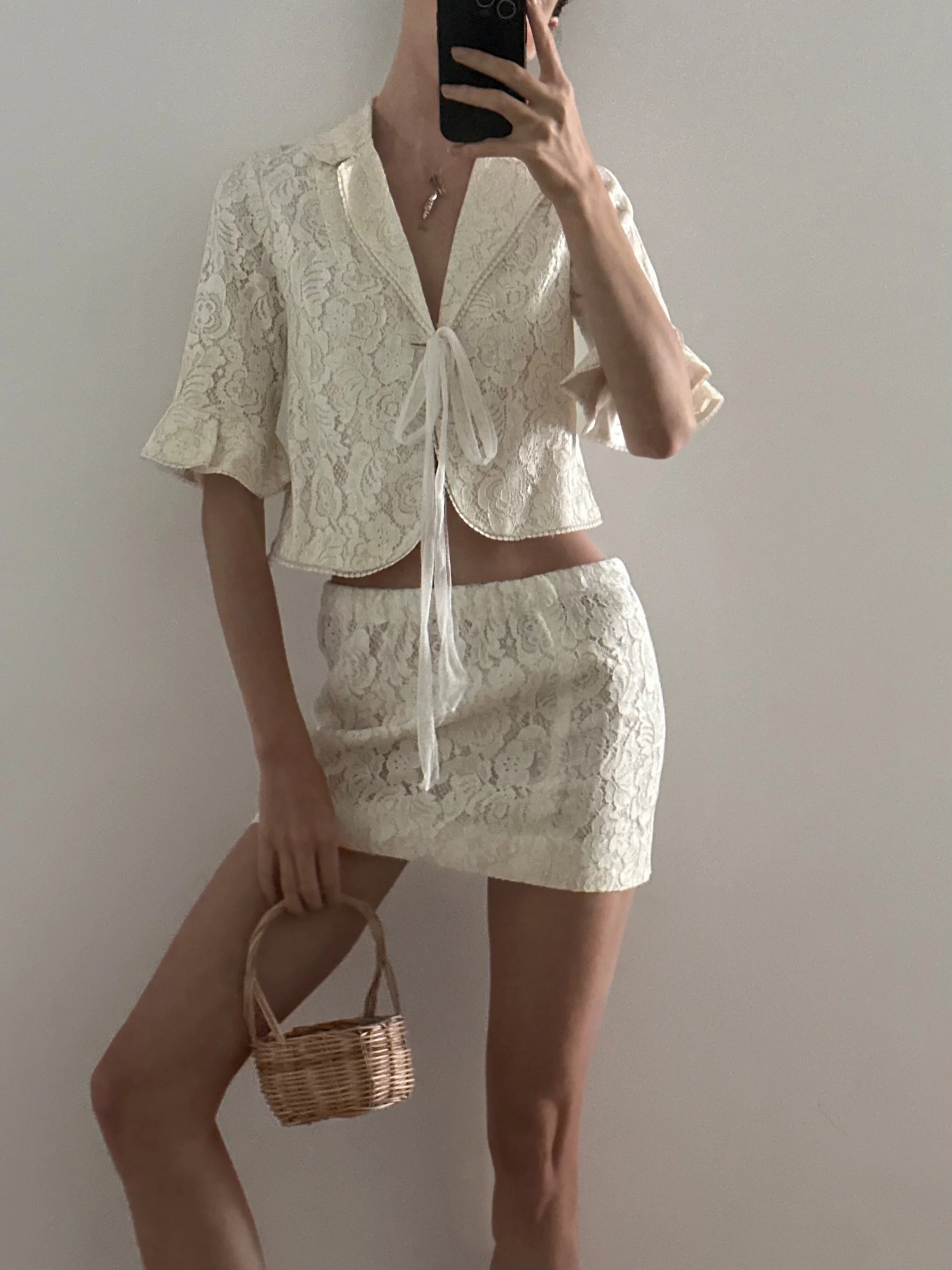Vintage 1960’s cream lace skirt set with reconstructed hemmed micro mini skirt and original matching bolero jacket.