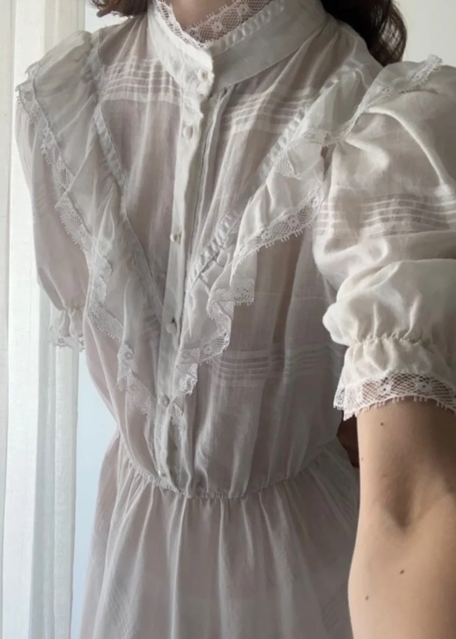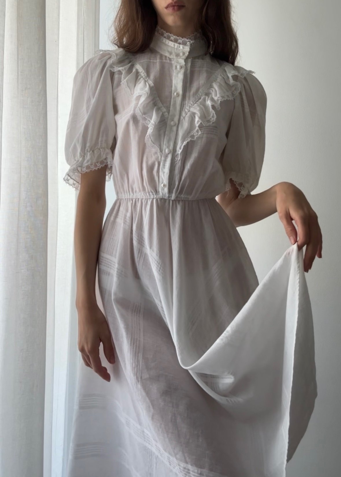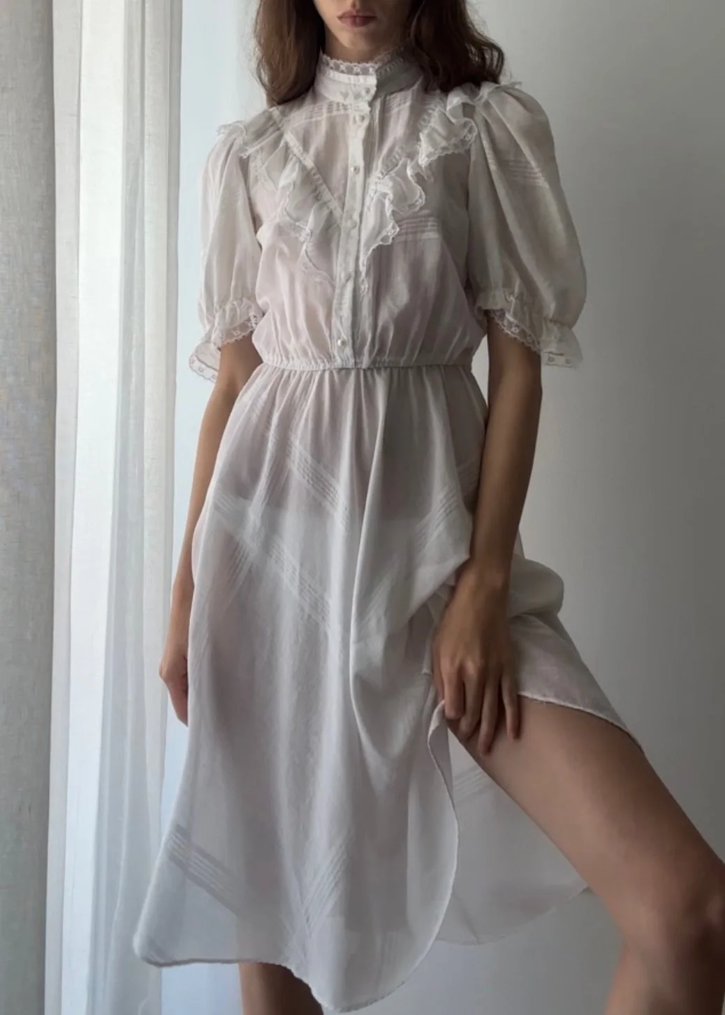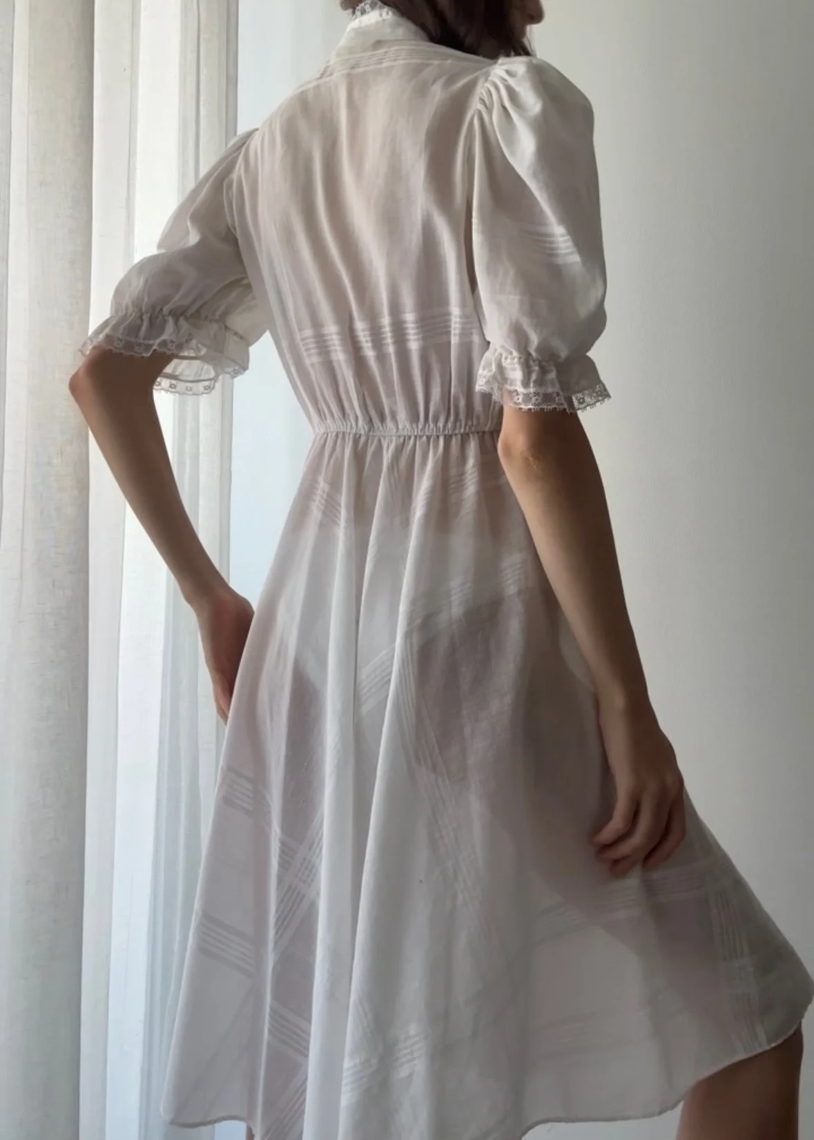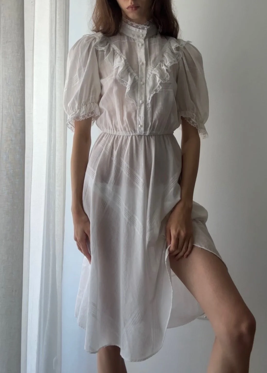 Vintage 1970’s “Young Romance” white cotton detail dress with button down front and ruffle details.