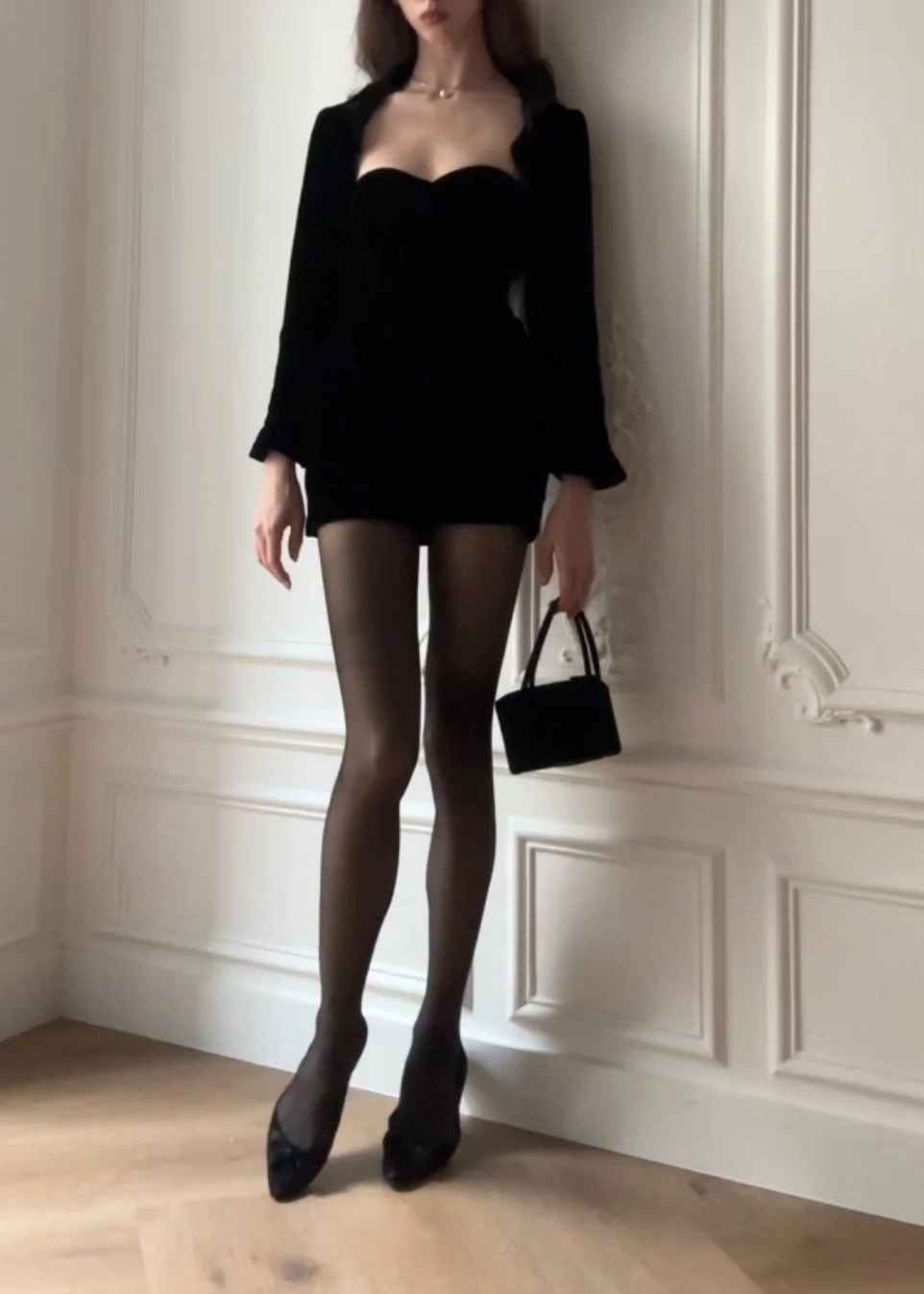 Vintage 1990’s black silk blend velvet two piece set featuring a micro mini dress and ruffle collar bolero.