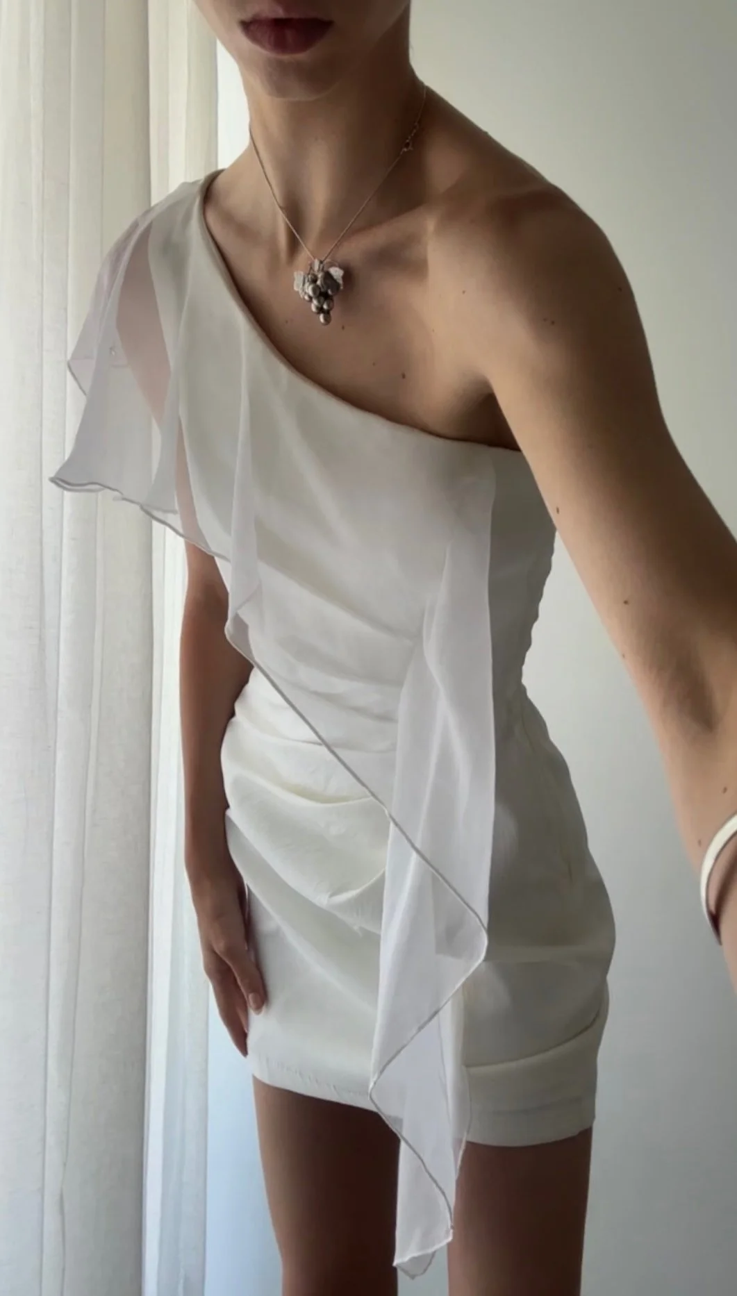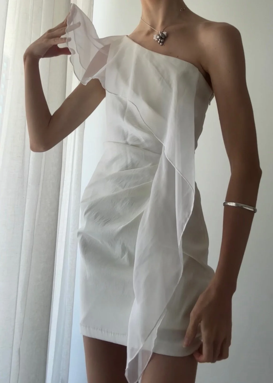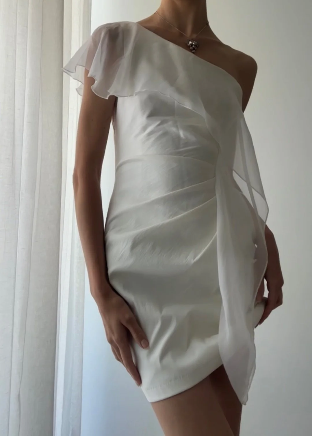 Vintage 90’s white fitted mini dress with stunning white chiffon wrap around flutter sash detail.