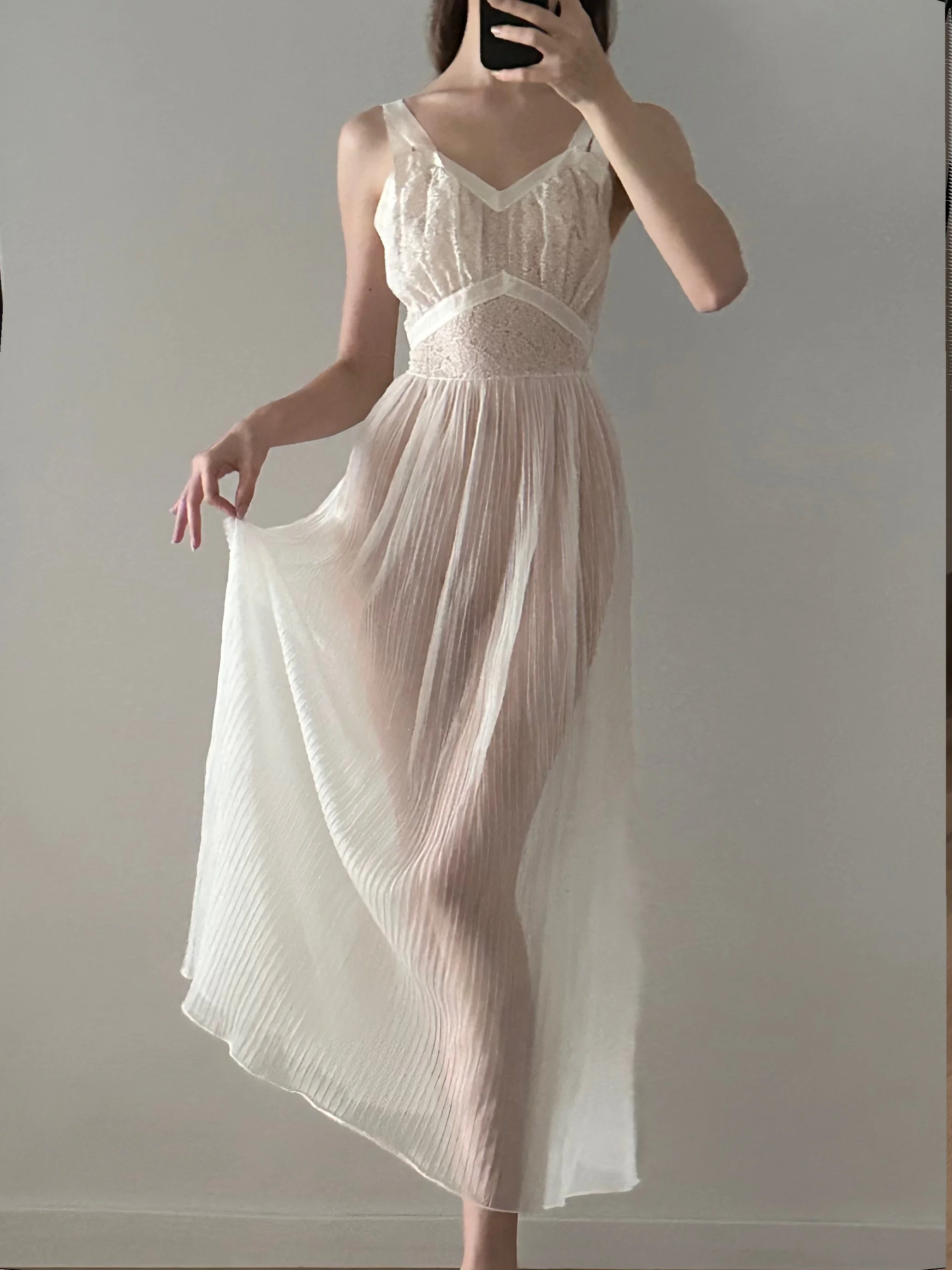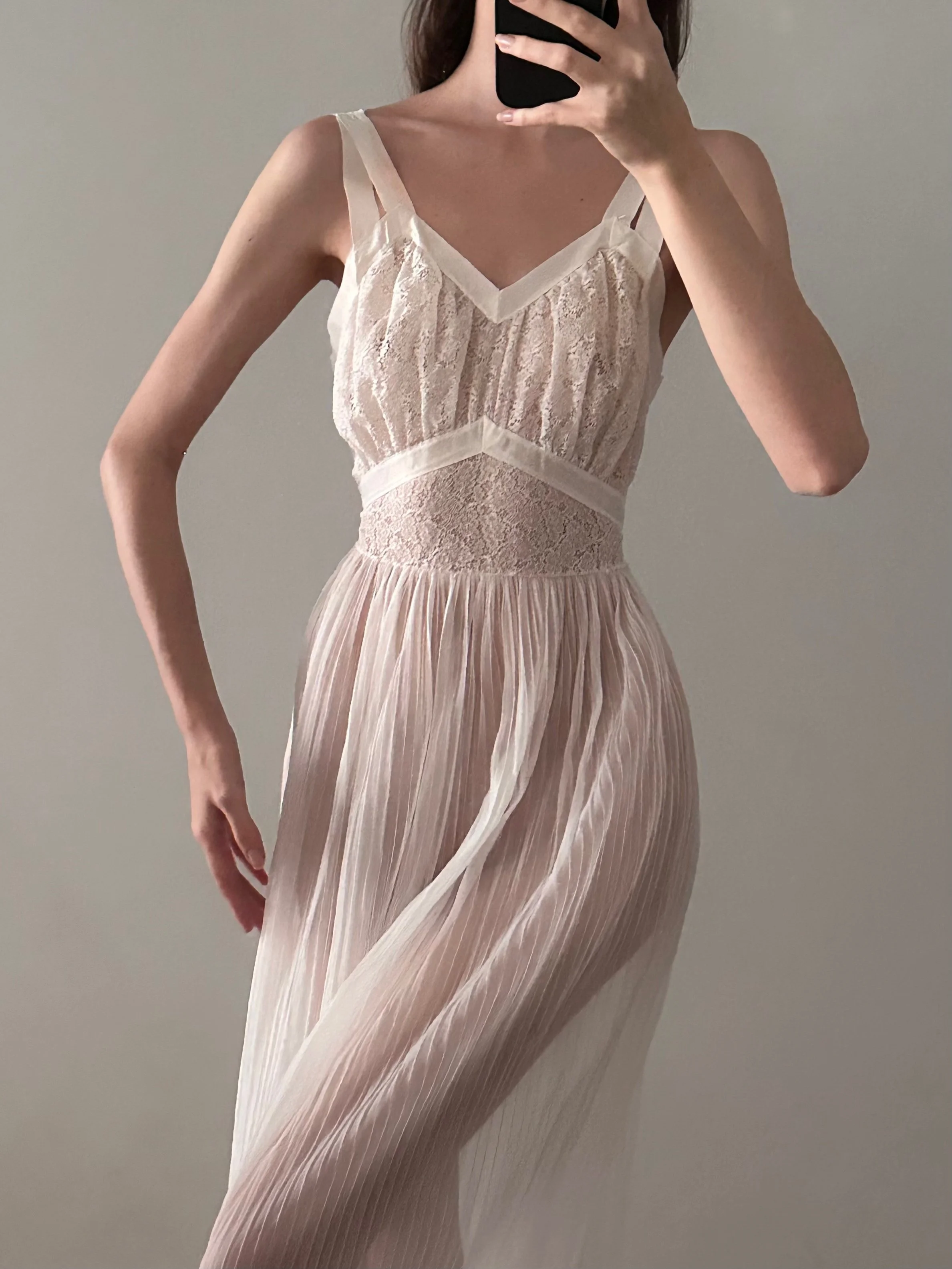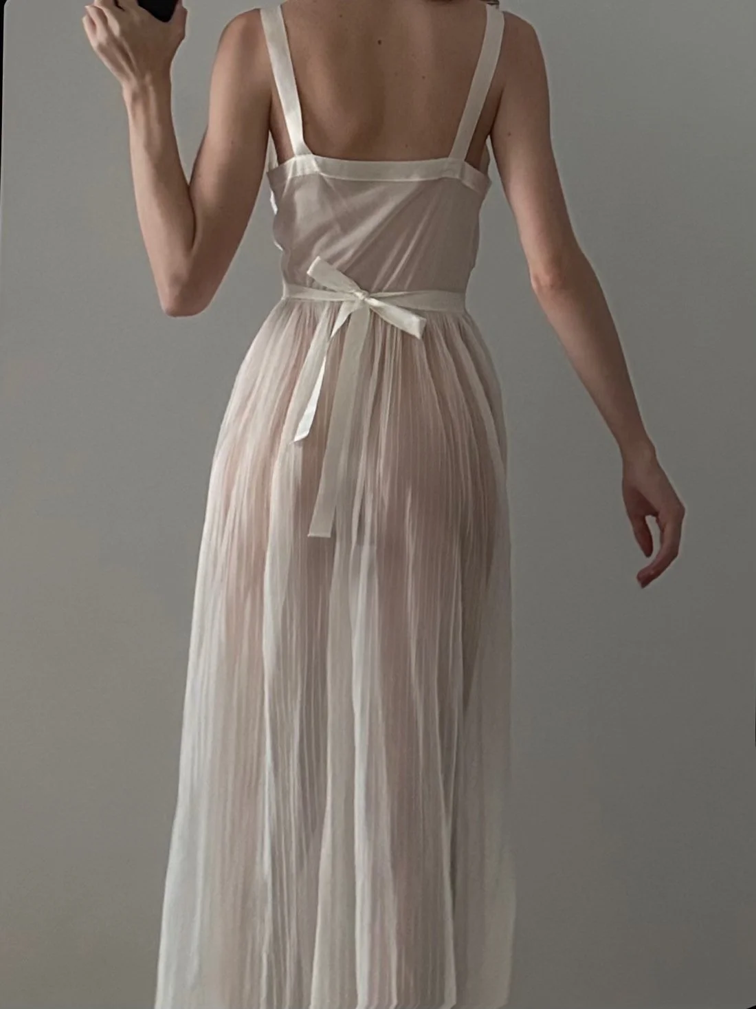 Vintage white semi sheer crystal pleated gown with fitted lace bodice and ribbon waist ties.