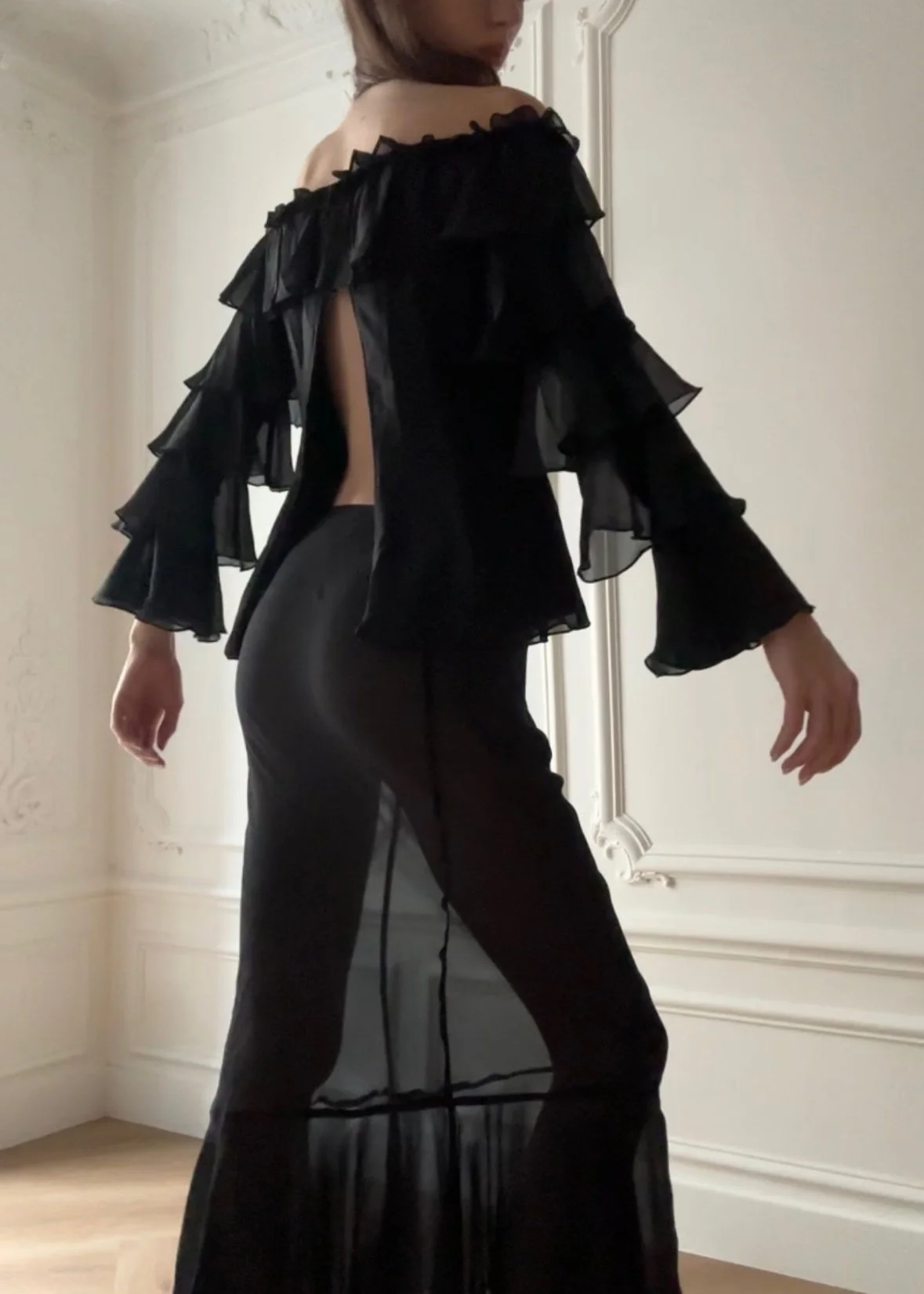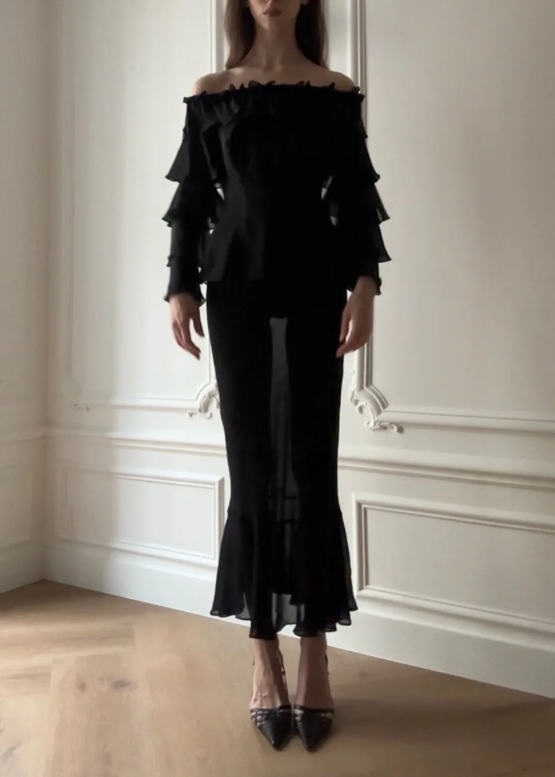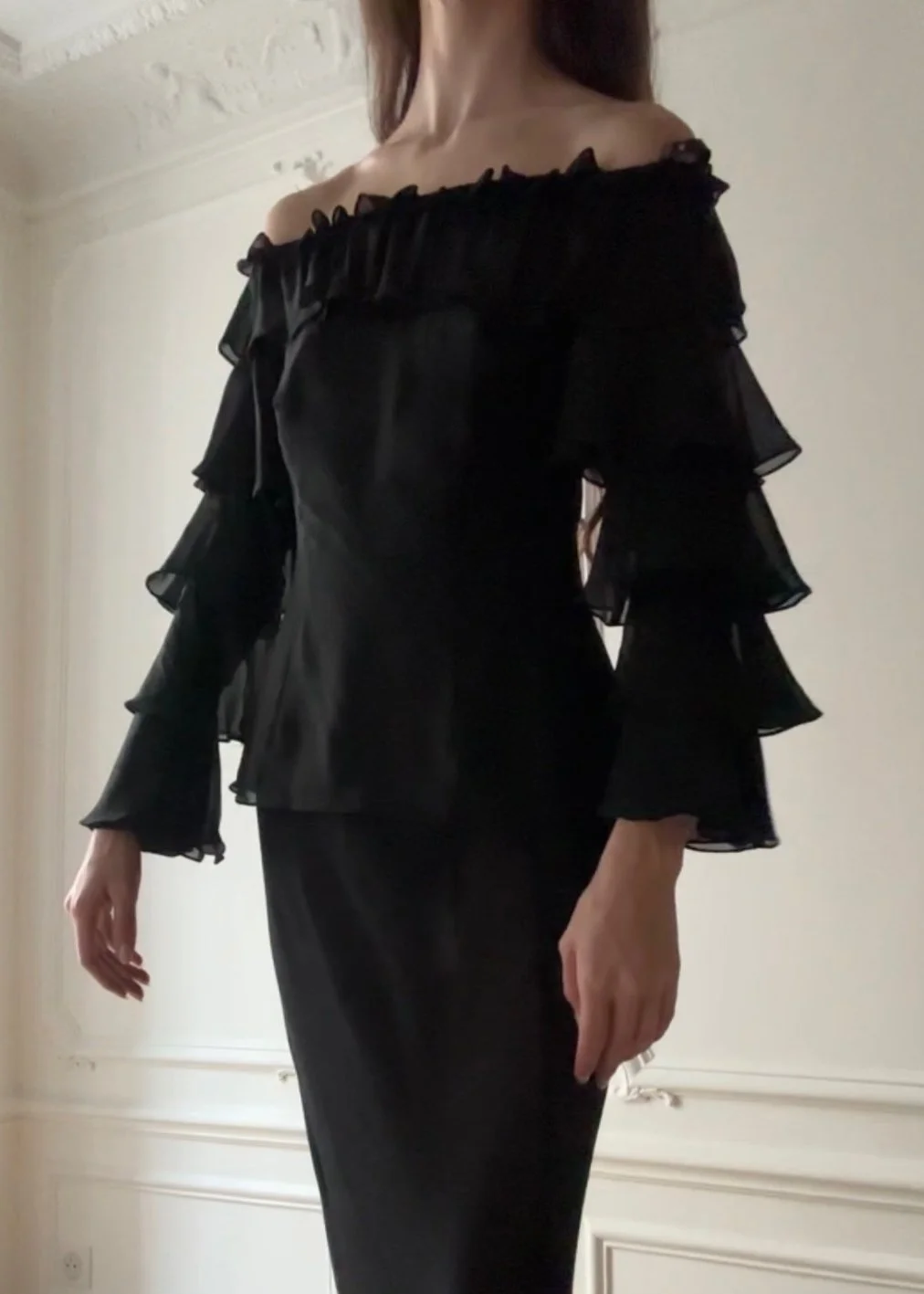 Vintage 90’s lux pure silk chiffon blouse with stunning off-the-shoulder neckline and tiered sleeves.