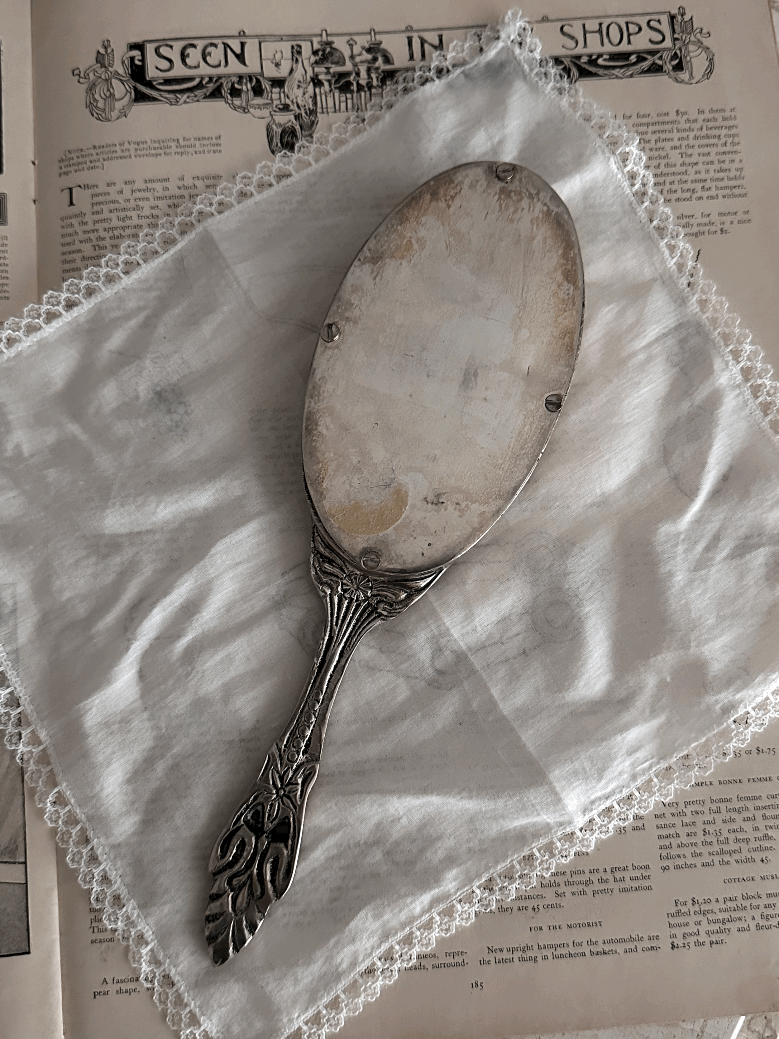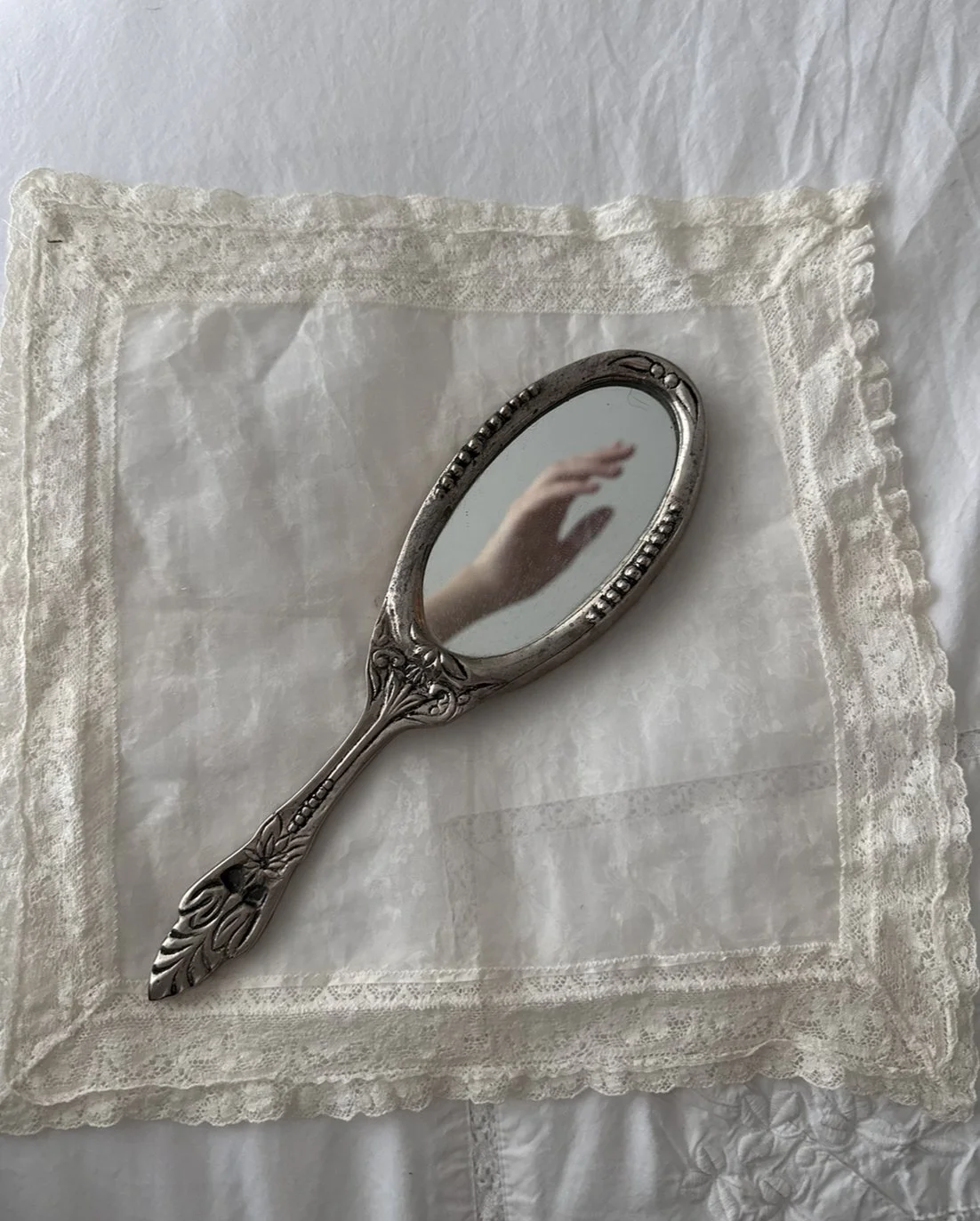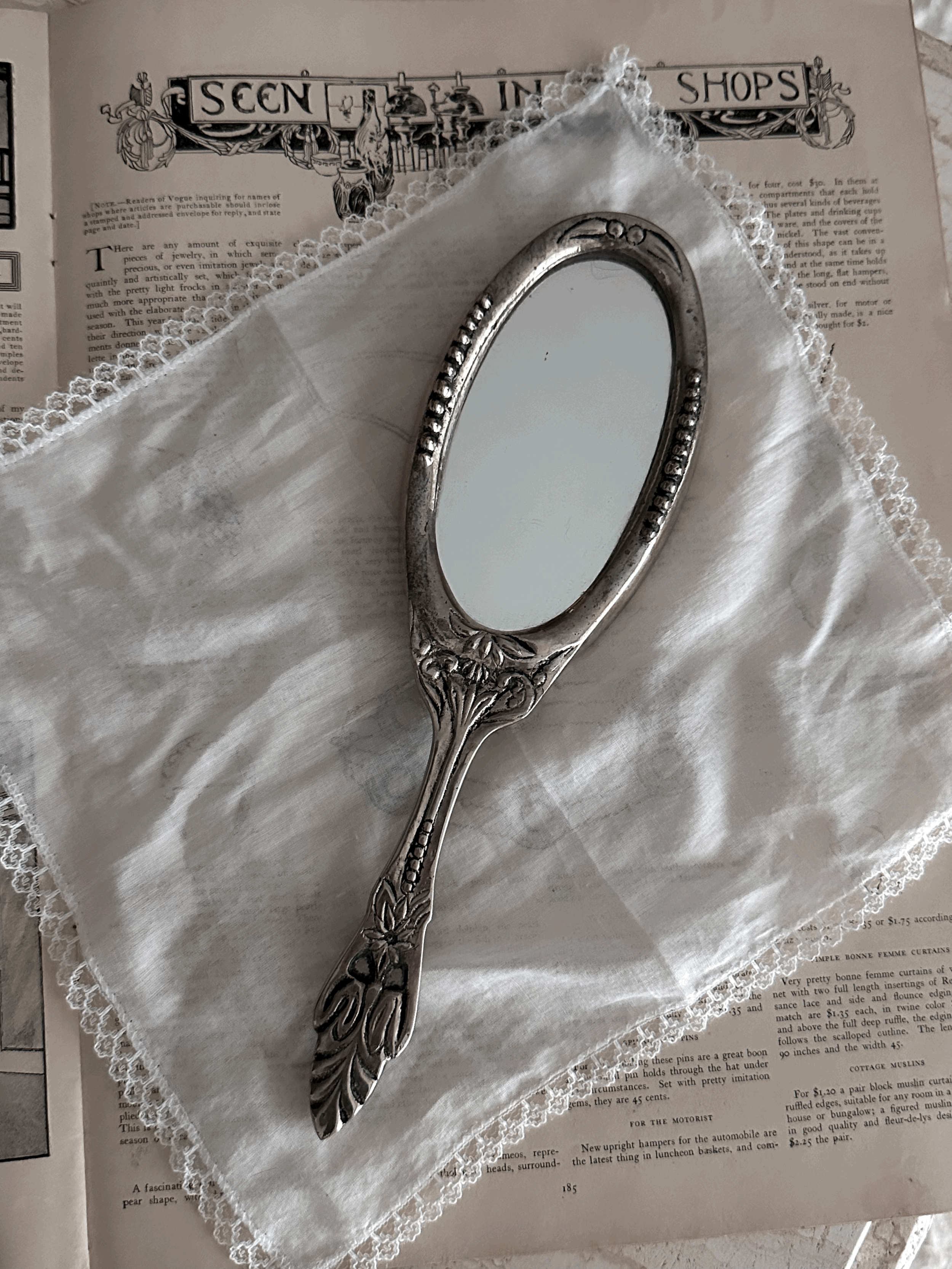 SALE › MINI SILVER HAND MIRROR Image 1 of 3 Image 2 of 3 Image 3 of 3 MINI SILVER HAND MIRROR Sale Price: $35.00 Original Price: $48.00 sold out Vintage silver plated miniature hand mirror. Sold Out Added! Vintage silver plated miniature hand mirror.