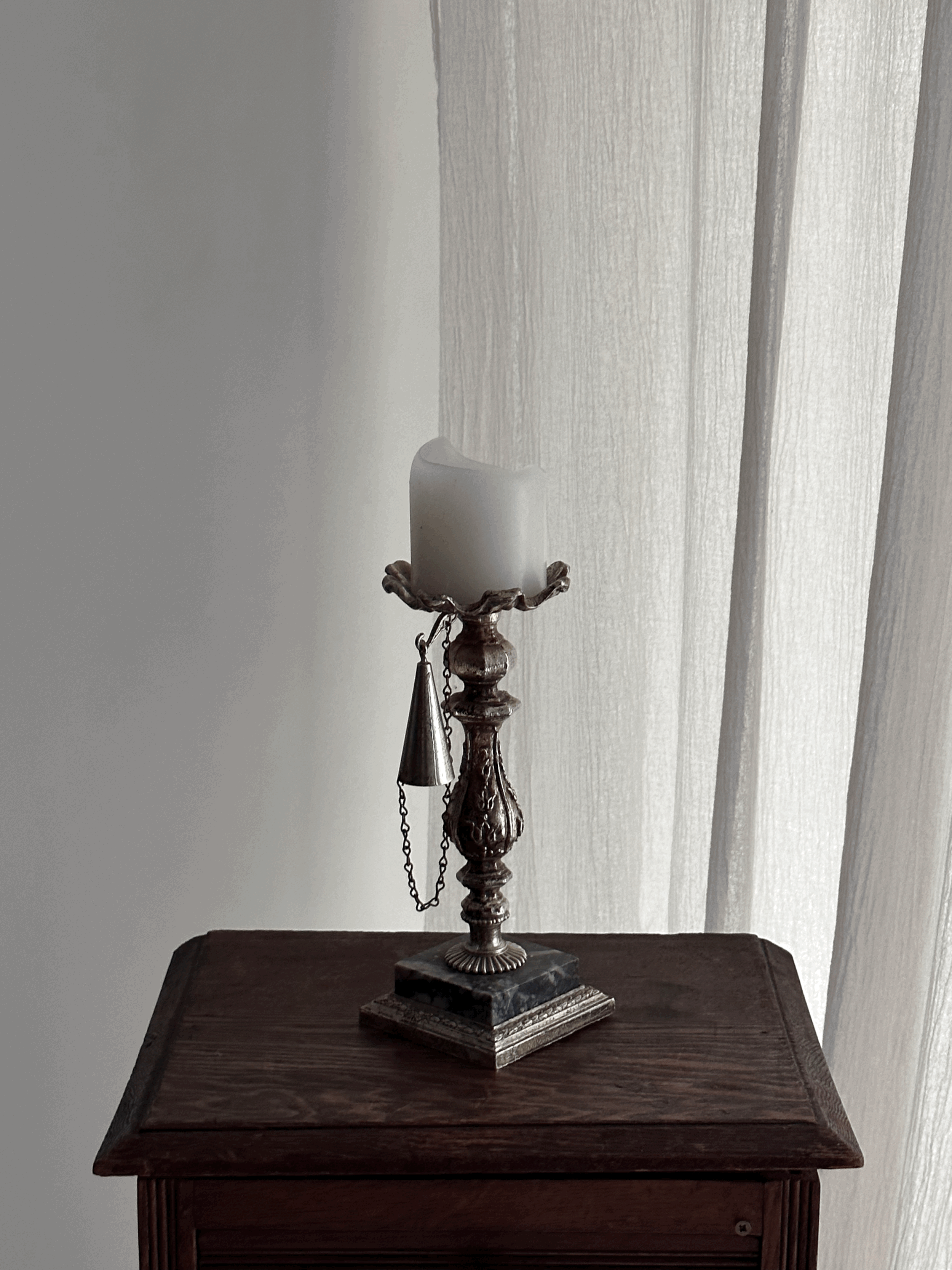 SALE › ORNATE MARBLE AND METAL CANDLE STICK HOLDER WITH ATTACHED SNUFF Image 1 of 1 ORNATE MARBLE AND METAL CANDLE STICK HOLDER WITH ATTACHED SNUFF Sale Price: $50.00 Original Price: $84.00 Vintage ornate candle stick holder with silver metal, marble base, and attached snuff. 14” tall Add To Cart Added! Vintage ornate candle stick holder with silver metal, marble base, and attached snuff. 14” tall