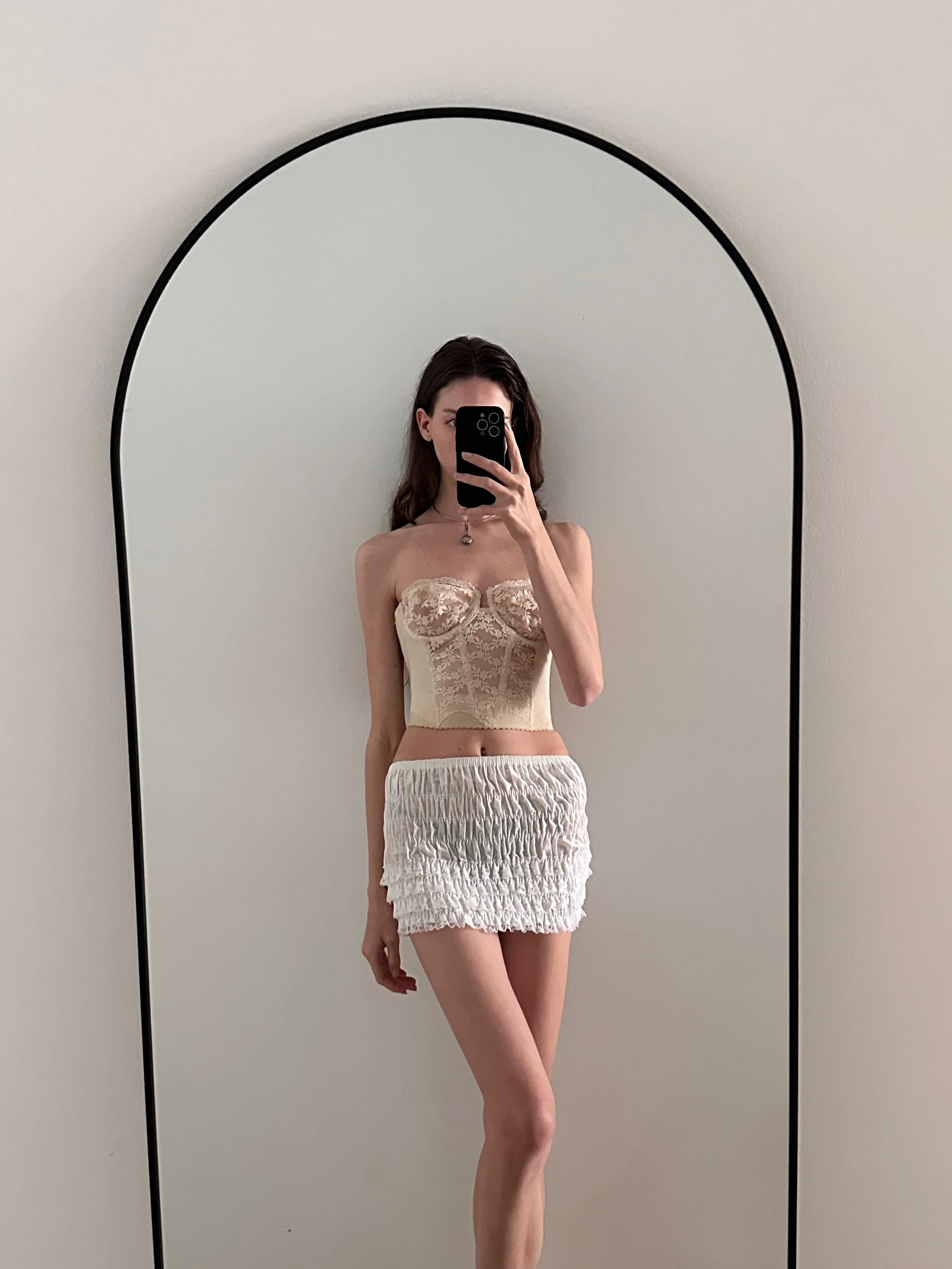SALE › RECONSTRUCTED WHITE RUFFLE MICRO MINI SKIRT (XS) Image 1 of 3 Image 2 of 3 Image 3 of 3 RECONSTRUCTED WHITE RUFFLE MICRO MINI SKIRT (XS) Sale Price: $50.00 Original Price: $98.00 Vintage reconstructed white ruched cotton ruffle detail mini skirt.15” long25-29” Waist 34-38” HipLots of stretch Add To Cart Added! Vintage reconstructed white ruched cotton ruffle detail mini skirt.15” long25-29” Waist 34-38” HipLots of stretch