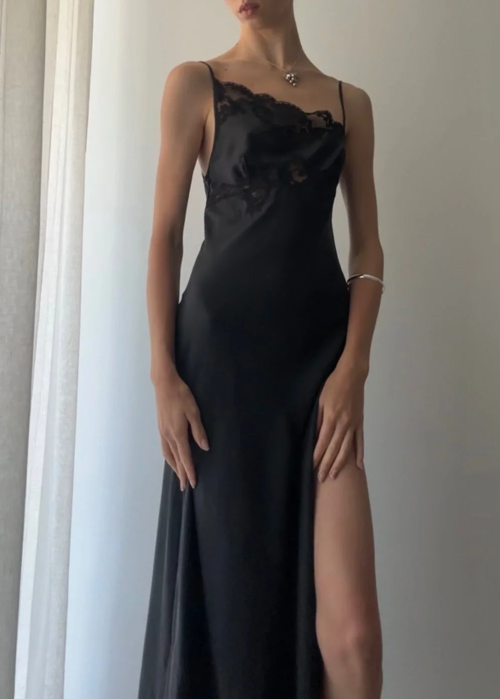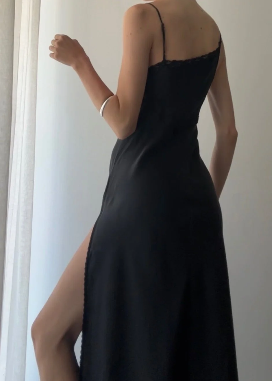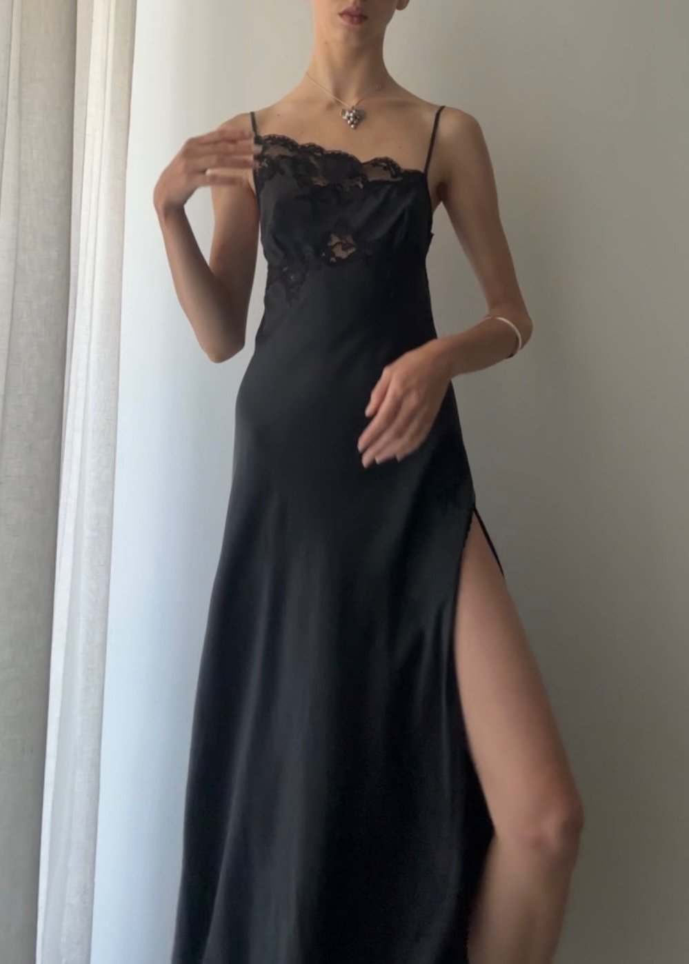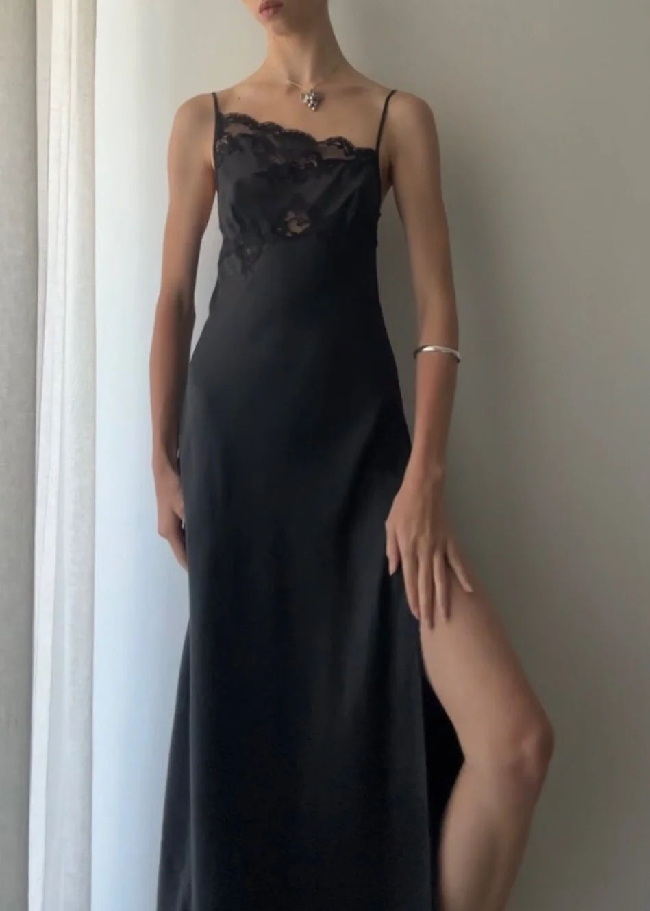 SALE › ROMANTIC BIAS CUT ASYMMETRICAL SILK GOWN (XS) Image 1 of 4 Image 2 of 4 Image 3 of 4 Image 4 of 4 ROMANTIC BIAS CUT ASYMMETRICAL SILK GOWN (XS) Sale Price: $100.00 Original Price: $218.00 sold out Vintage 1990’s black pure silk slip dress with stunning high slit and lace detail. Size XS 31-33” Bust 27-29” Waist Sold Out Added! Vintage 1990’s black pure silk slip dress with stunning high slit and lace detail. Size XS 31-33” Bust 27-29” Waist