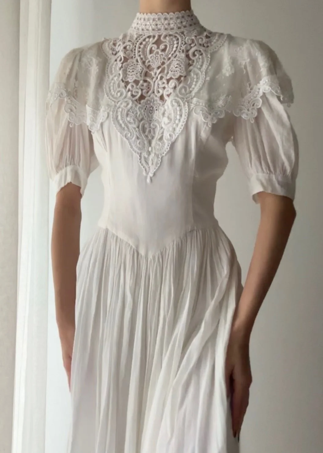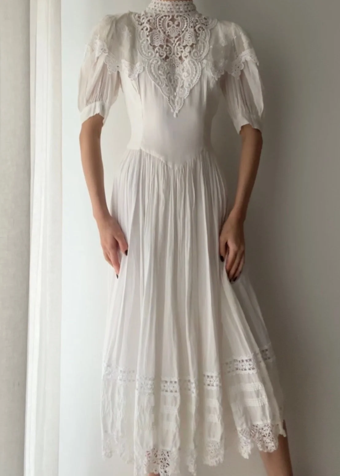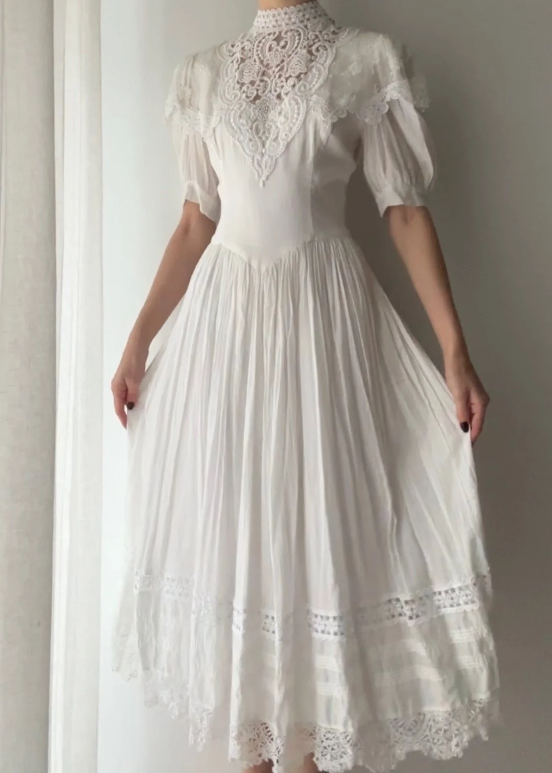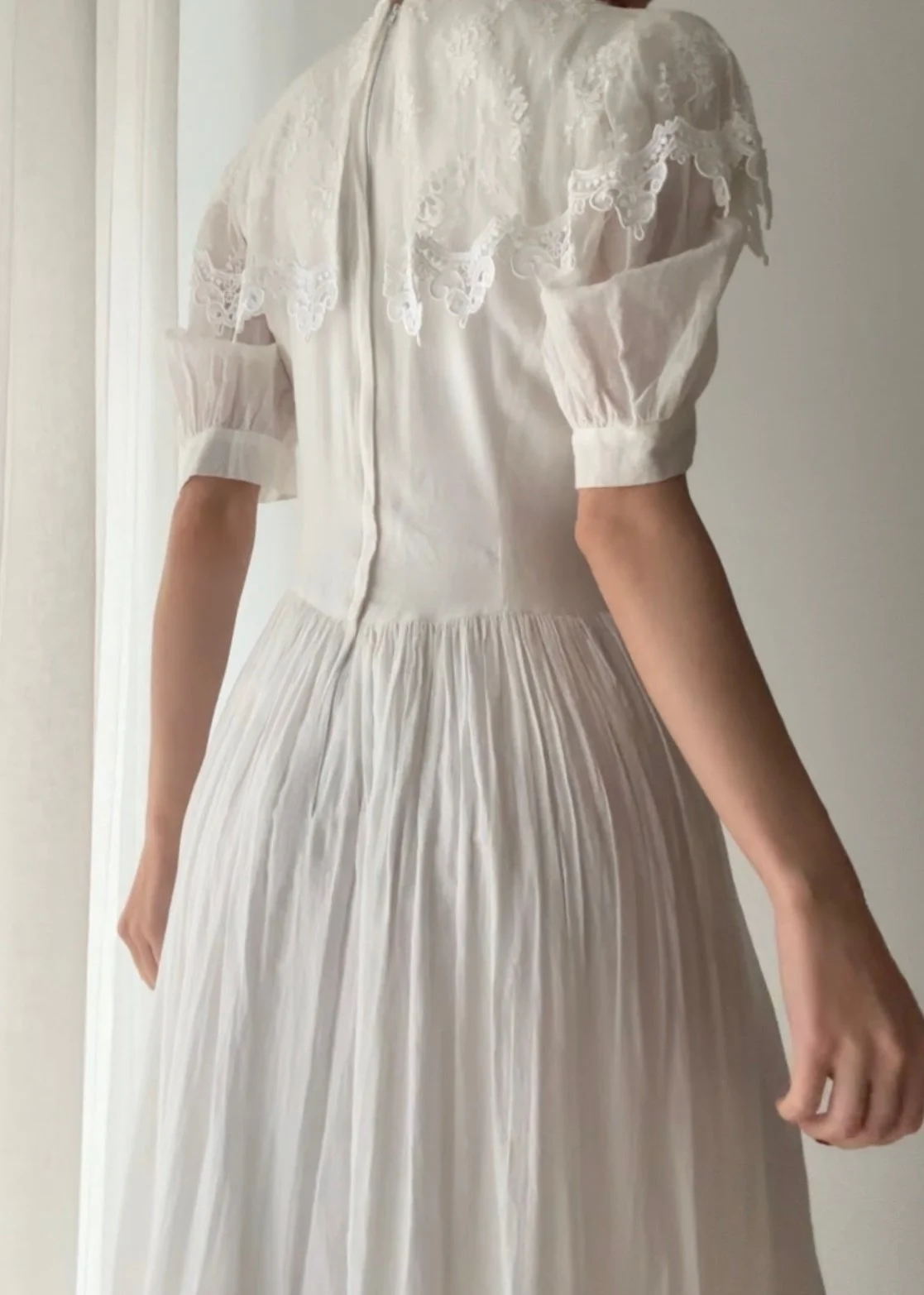 Vintage white cotton sweetheart dress with subtle puff sleeves, elegant lace collar, and pleated cotton skirt.