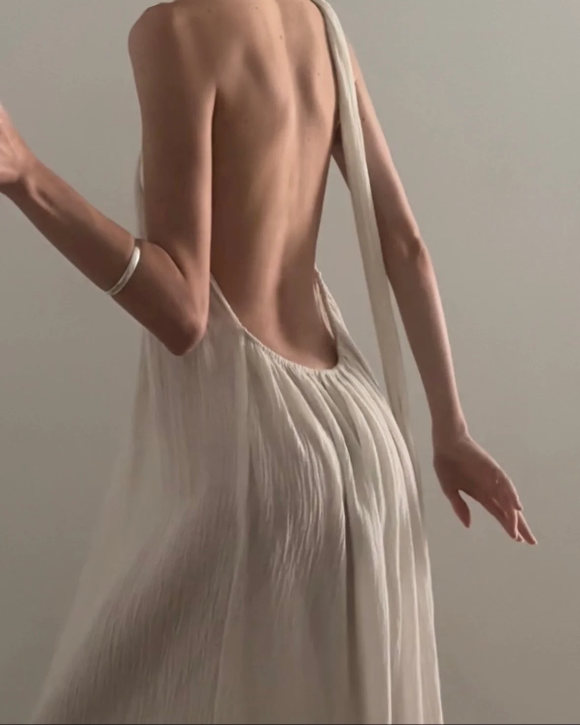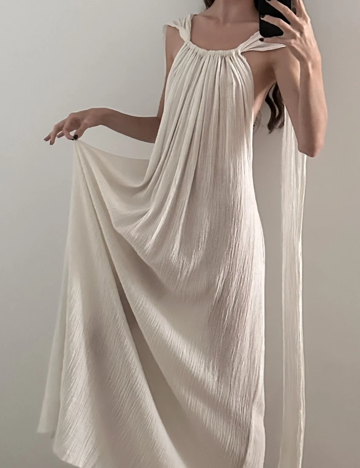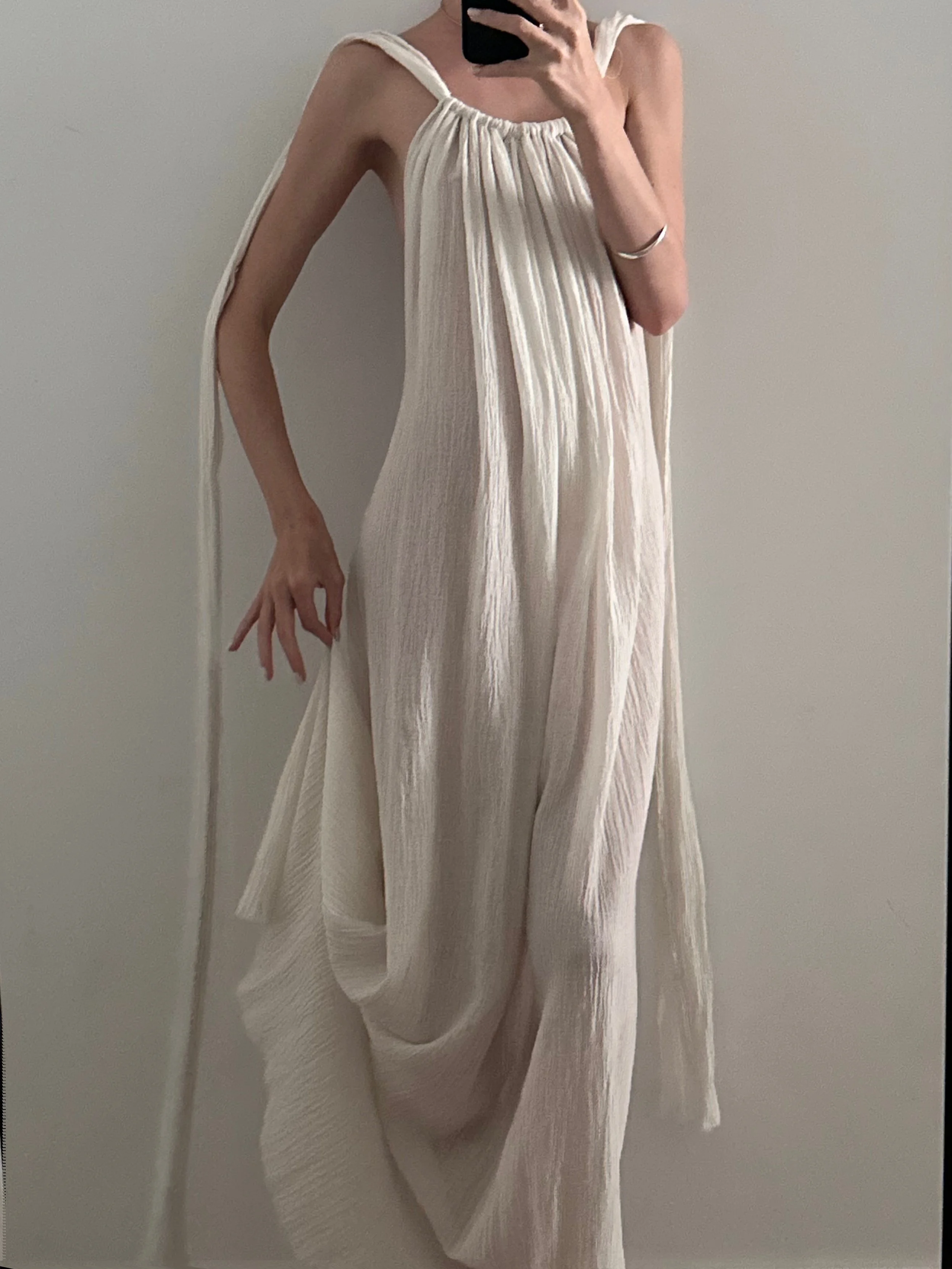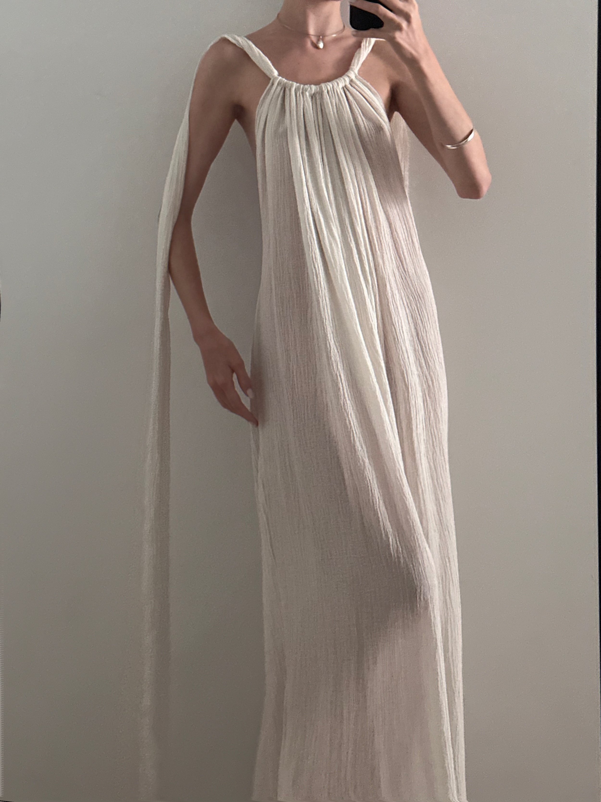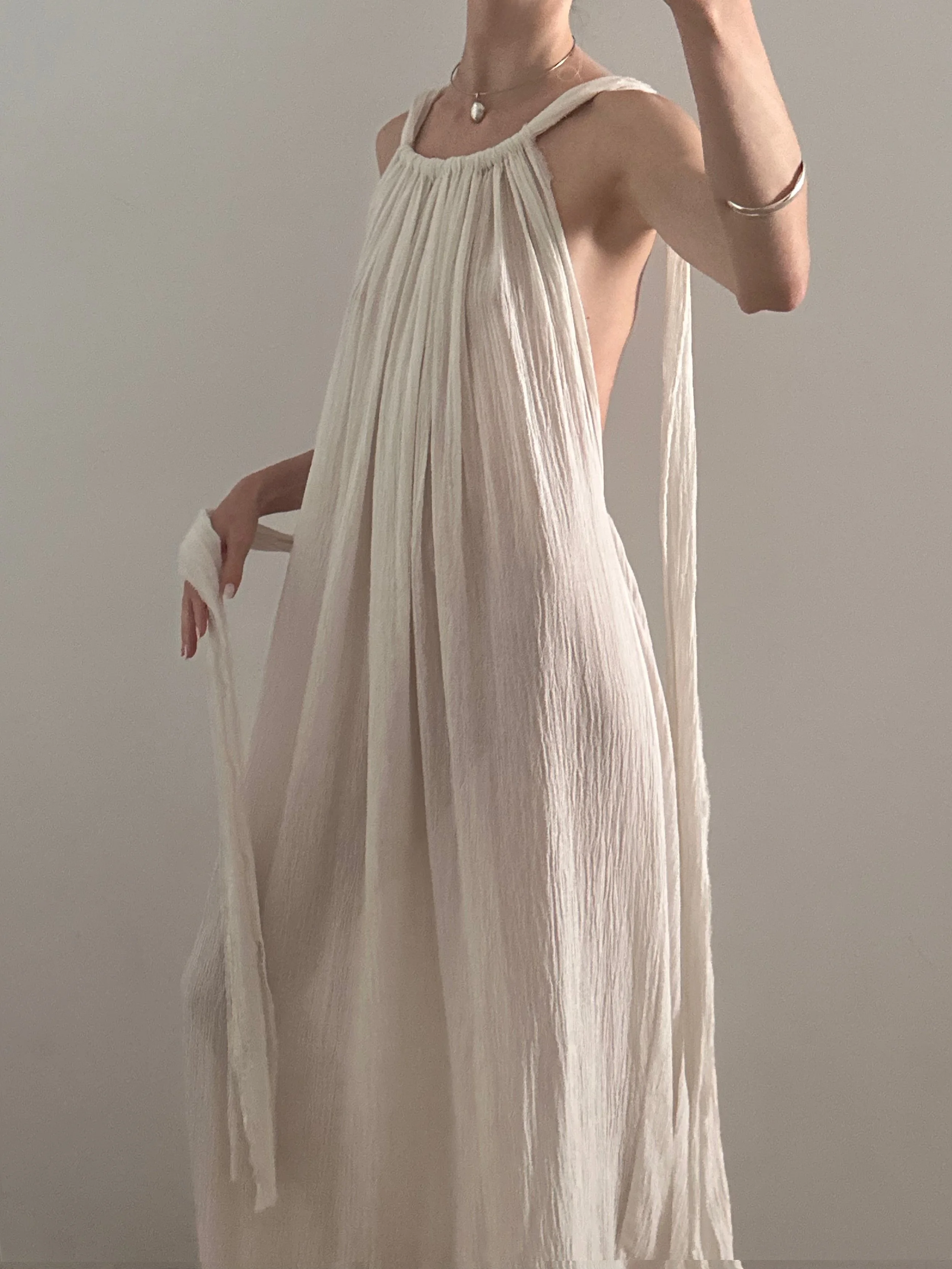 One of a kind handmade gown with plunge open back, halter neckline, and flowing sashes in natural off-white natural cotton crepe pleated gauze.