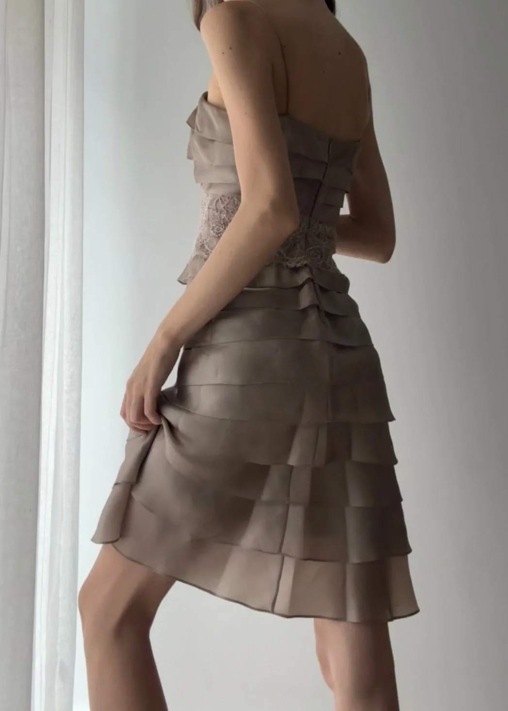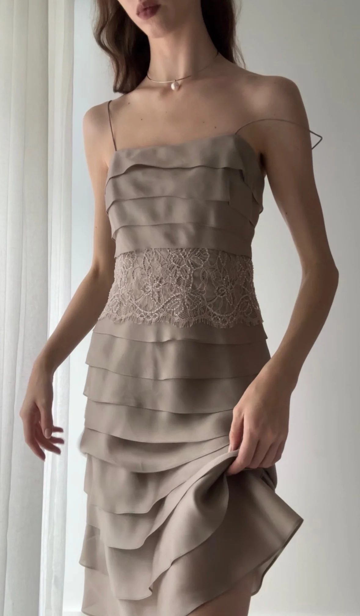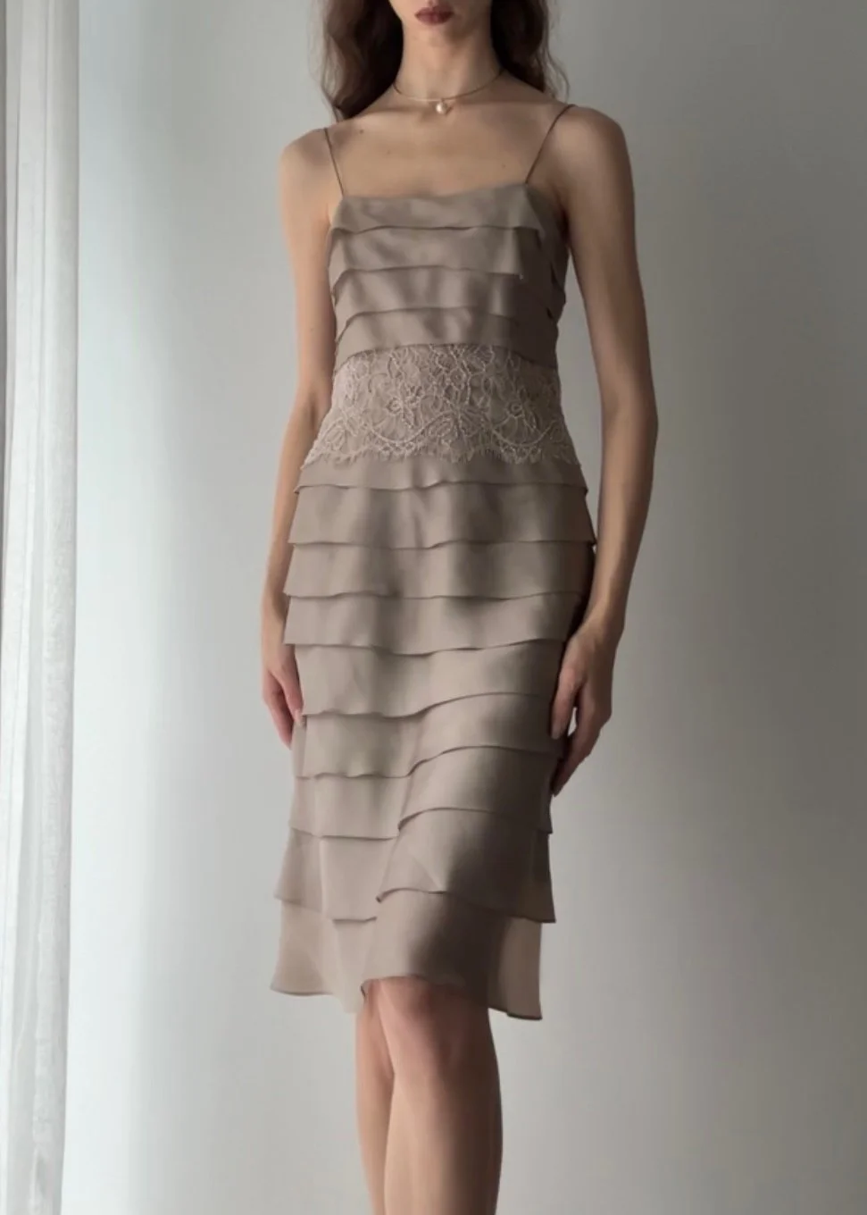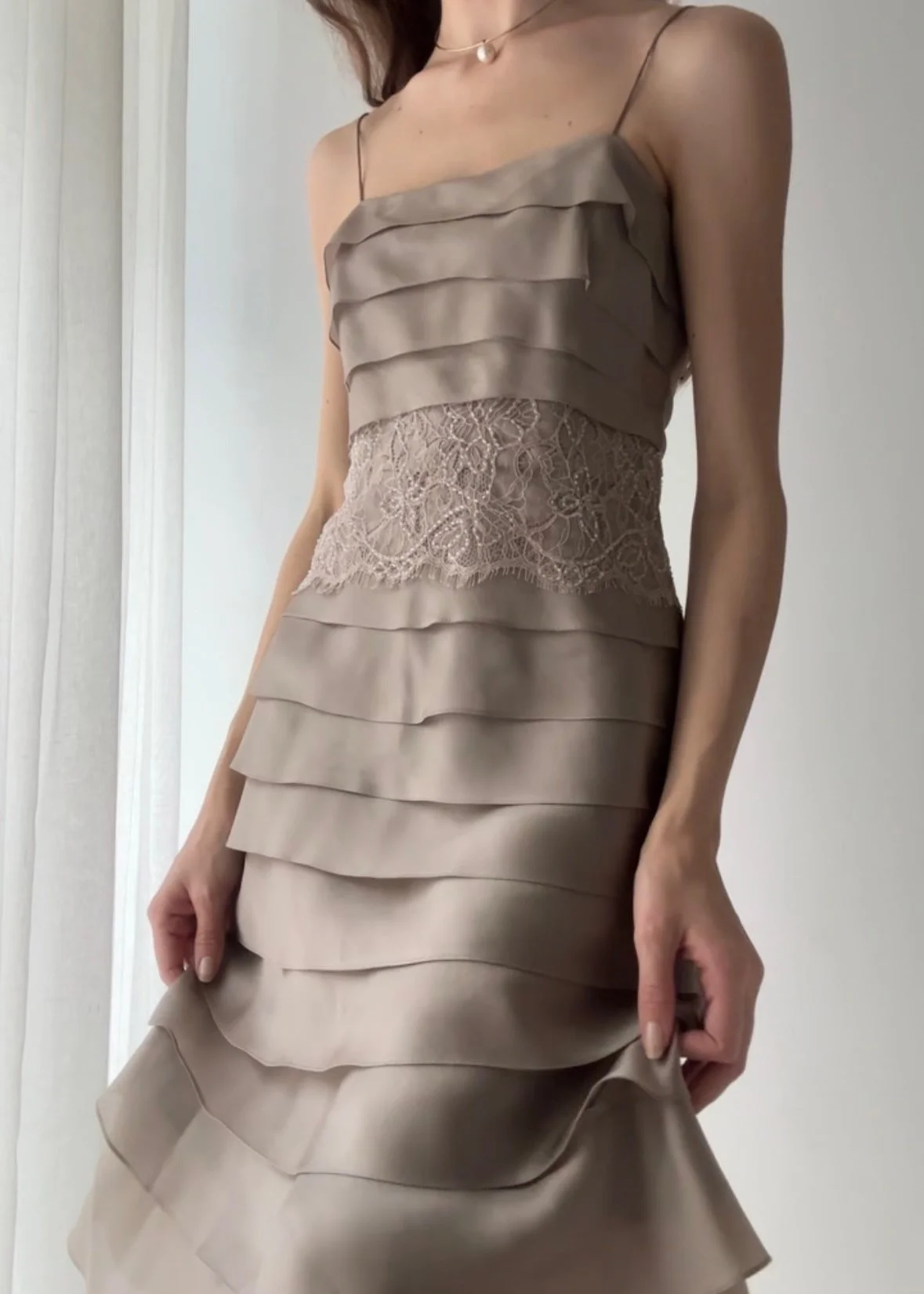 Vintage Y2K mauve silk organza tiered dress with cream lace overlay dteial and thin spaghetti straps.