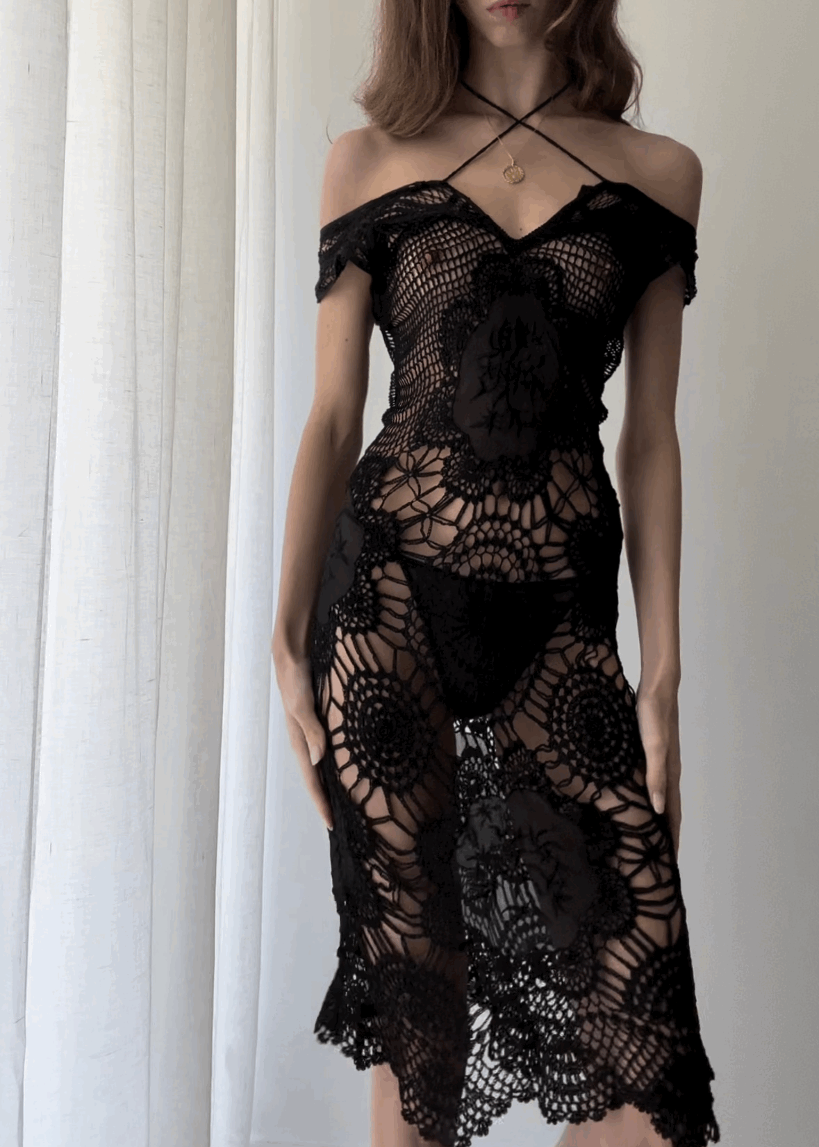 Vintage 90’s black rayon crochet knit dress with ethereal pattern, circle embroidered silk chiffon panels, and multiple ways ruched neckline with tassel ties.