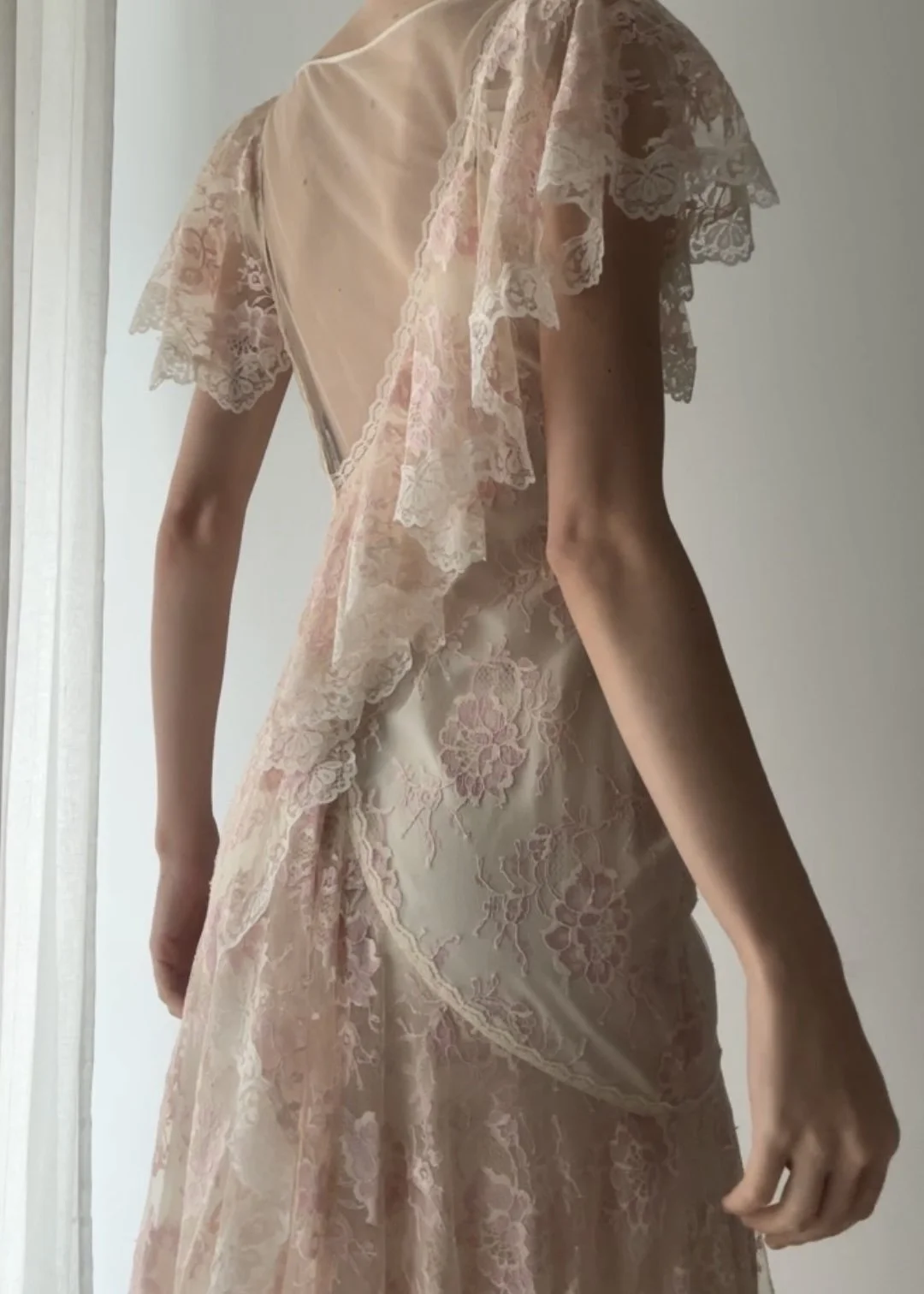 Vintage asymmetrical cherry blossom lace dress with stunning flutter sleeves, mesh plunge back, and mermaid hem.